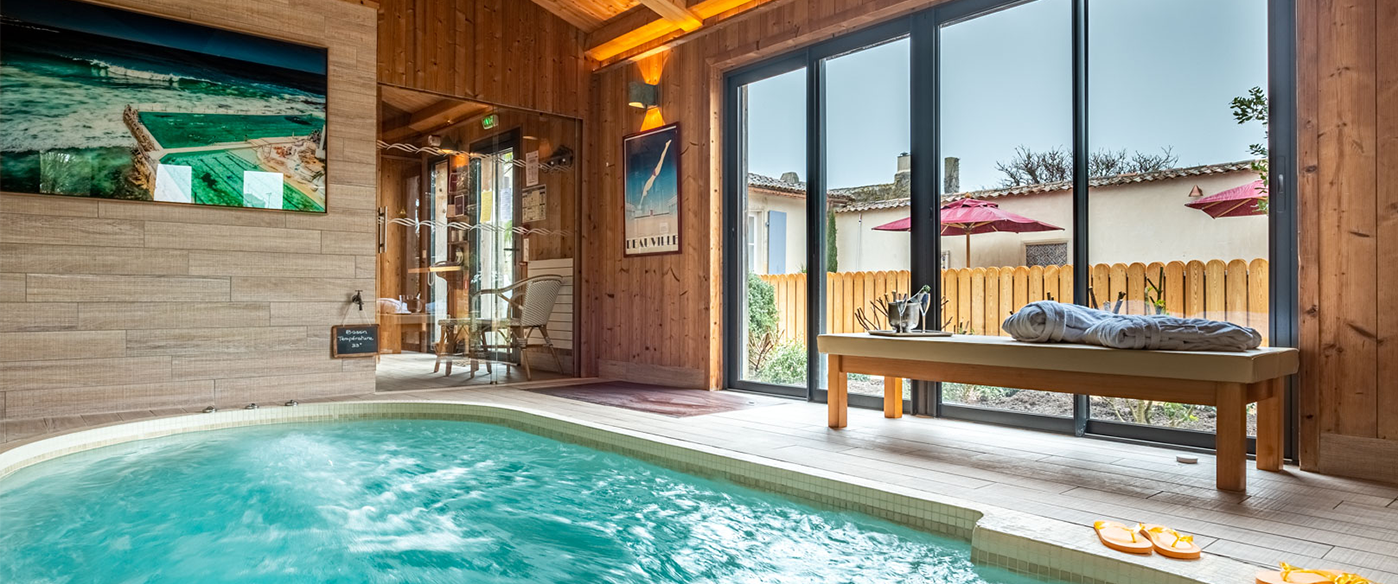In the heart of the Ile de Ré, at La Baronnie Hôtel & Spa, a 4-star hotel in Saint-Martin de Ré, enjoy a Spa just for you. A unique opportunity to recharge your batteries in the wellness area, surrounded by greenery and opening out onto a garden with its large picture windows and glass roof. It features a counter-current swimming pool, a jacuzzi with balneotherapy jets and a sauna. Operating on a private basis, the Spa is available on reservation (2 people maximum) and is not accessible to children under 16. In the adjoining beauty cabin, a qualified beautician offers men and women face and body treatments from the prestigious Cinq Mondes range. An osteopath offers treatments by appointment. The wellness area is also open to guests from outside the hotel, by appointment only.