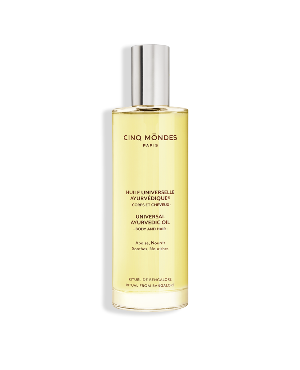 L’Huile Universelle Ayurvédique® s’inspire des huiles issues de l’Ayurvéda, traditionnellement utilisées dans les massages du sud de l’inde pour apaiser et protéger. Combinant des huiles de sésame, moringa et chaulmoogra, cette huile apaisante d'exception offre une expérience sensorielle unique pour le corps et les cheveux. Elle nourrit instantanément et durablement la peau, tout en la protégeant du vieillissement prématuré. Idéale en massage pour toutes les peaux ou en soin pour les cheveux abîmés ou fatigués.